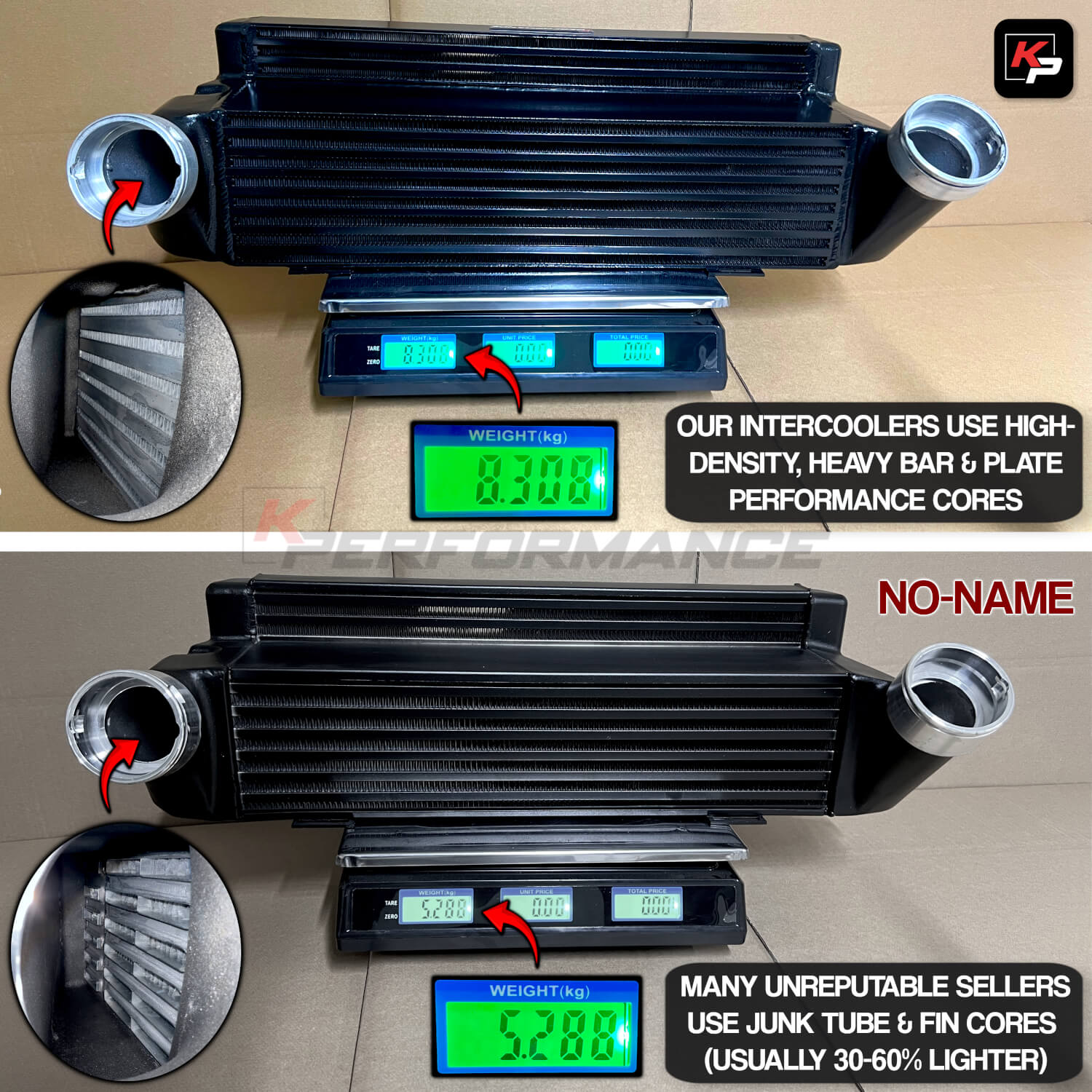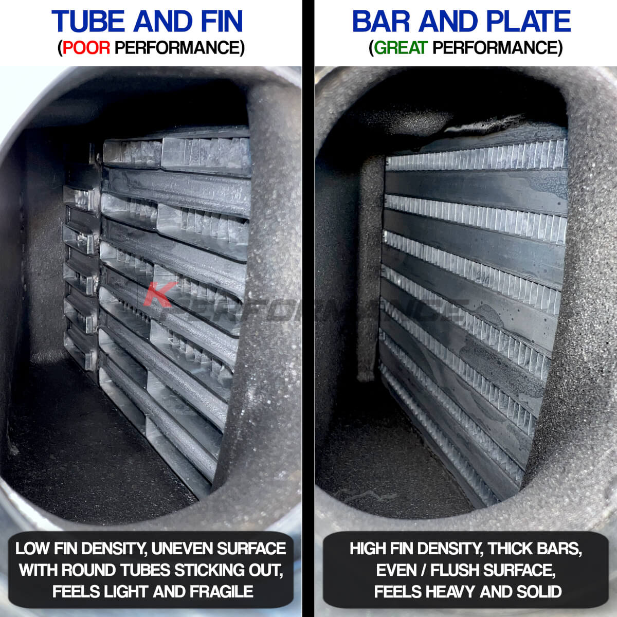 Many less reputable sellers offer intercoolers that may look identical on the outside, but inside they use a cheap Tube & Fin core. These cores are typically 30–60% lighter, far less durable, and deliver only a fraction of the cooling performance of a true Bar & Plate intercooler.